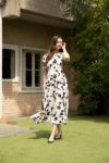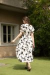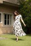 滑らかな質感とドレーピーな印象を与えるドレスに仕立てました。吸水力の高いレーヨンを使用することで夏場でもさらっと着ていただけます。オリジナルカラーでプリントしたこだわりのドレスとなっております。気品のある柄になっており、1枚でも羽織りと合わせていただいてもコーディネート映えする1品です。