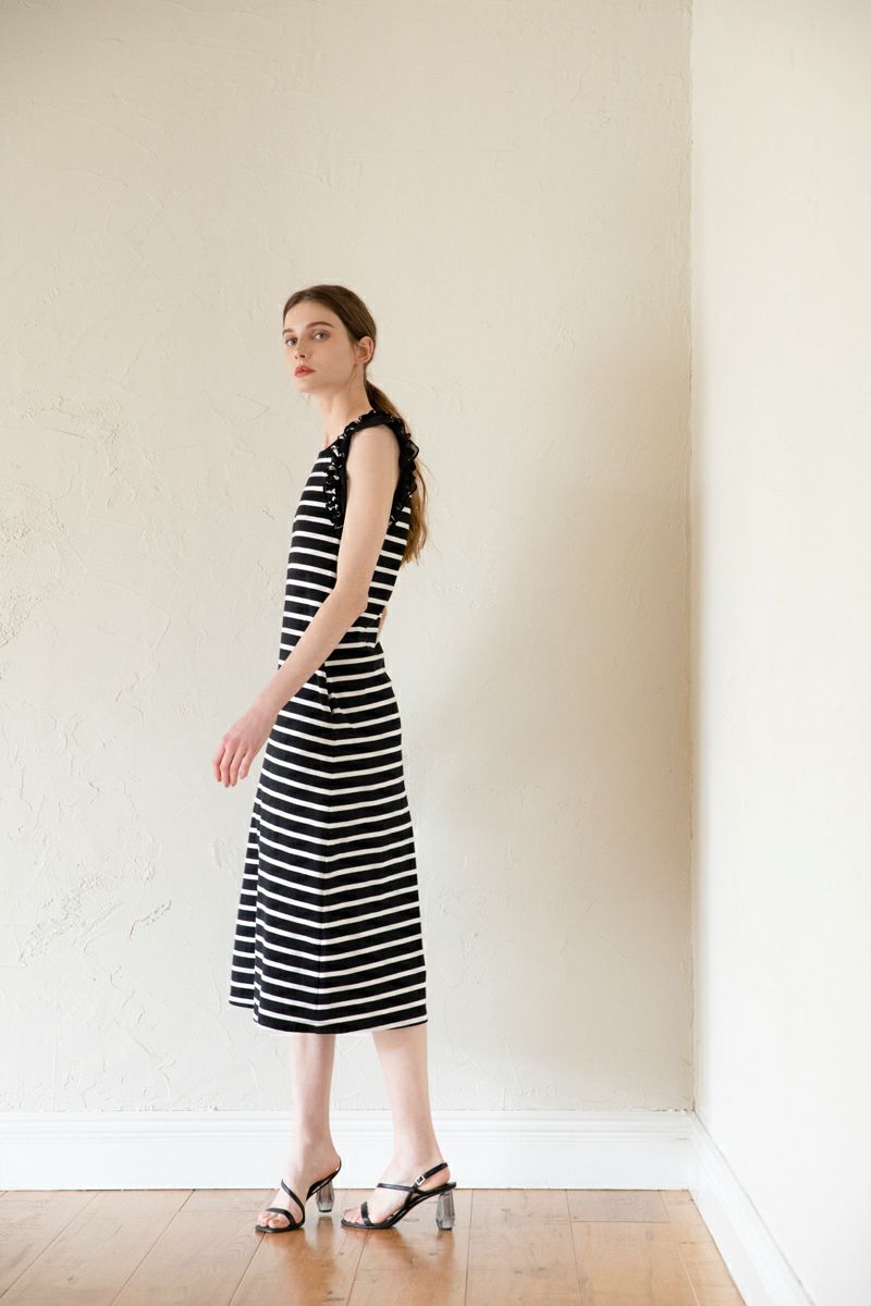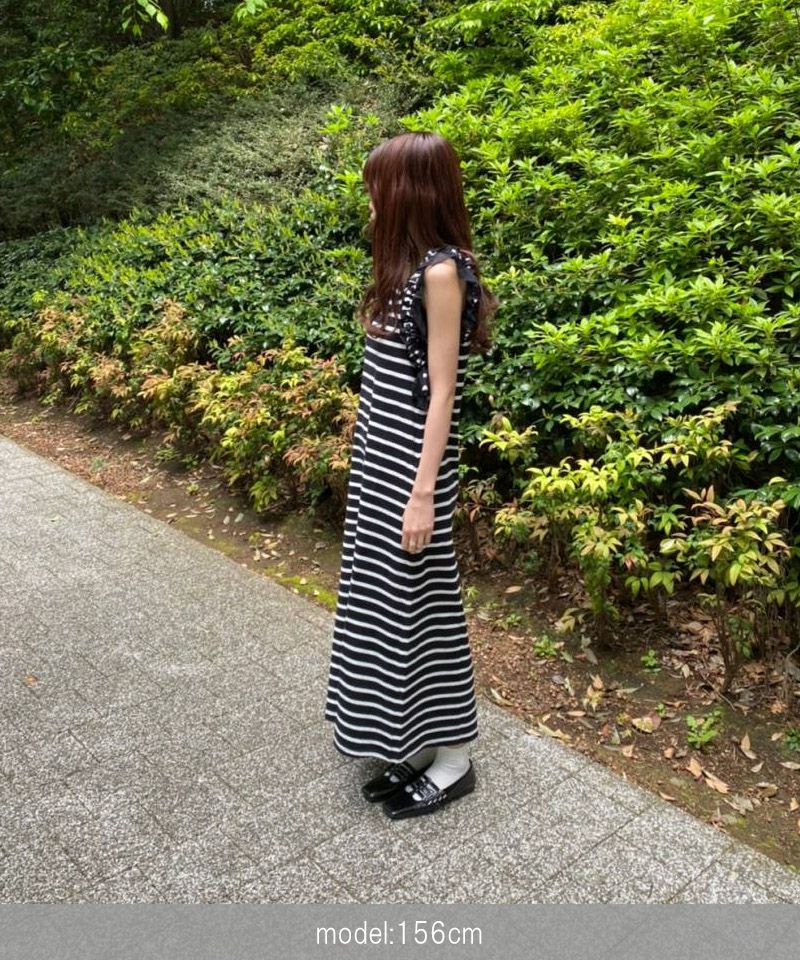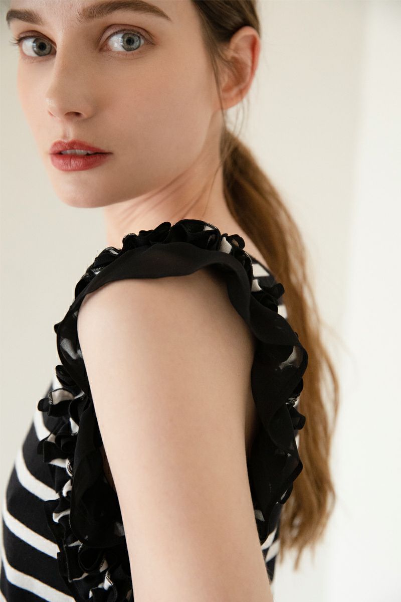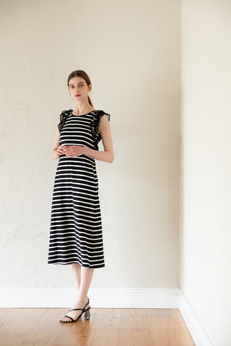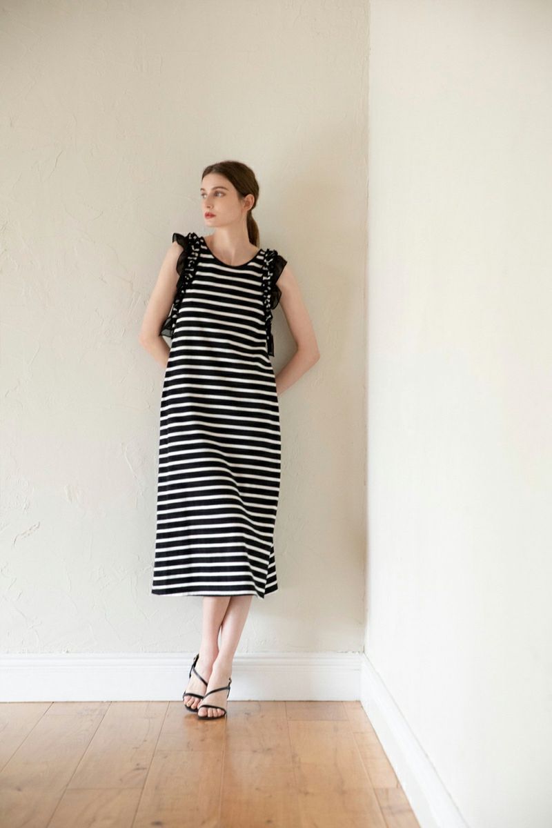 ノースリーブフラワーフリルカットワンピース BK×WH