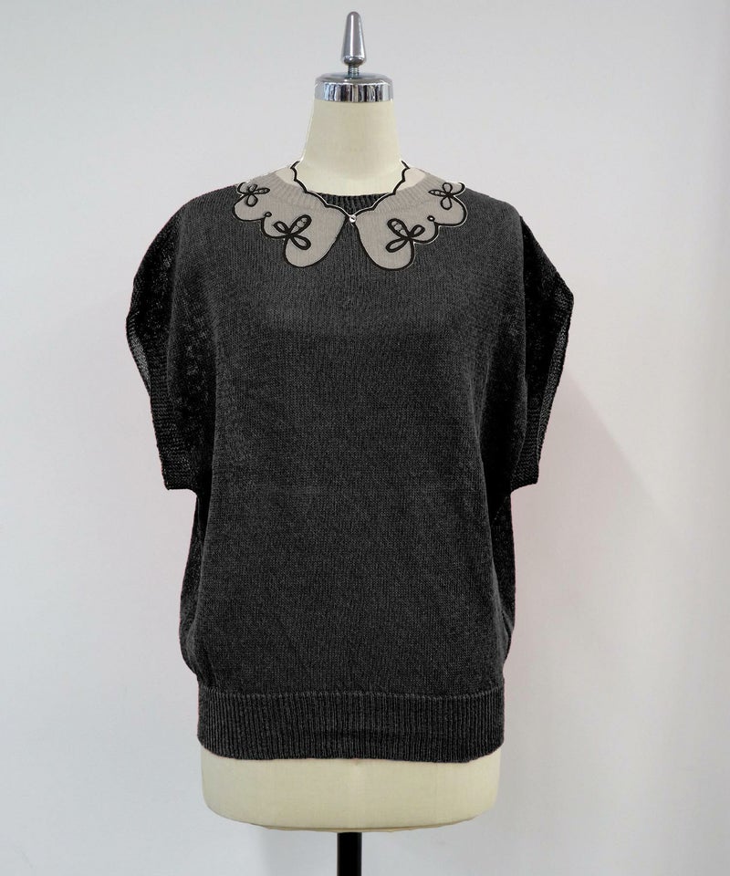 オリジナル刺繍付け襟がセットのフレンチスリーブニット。